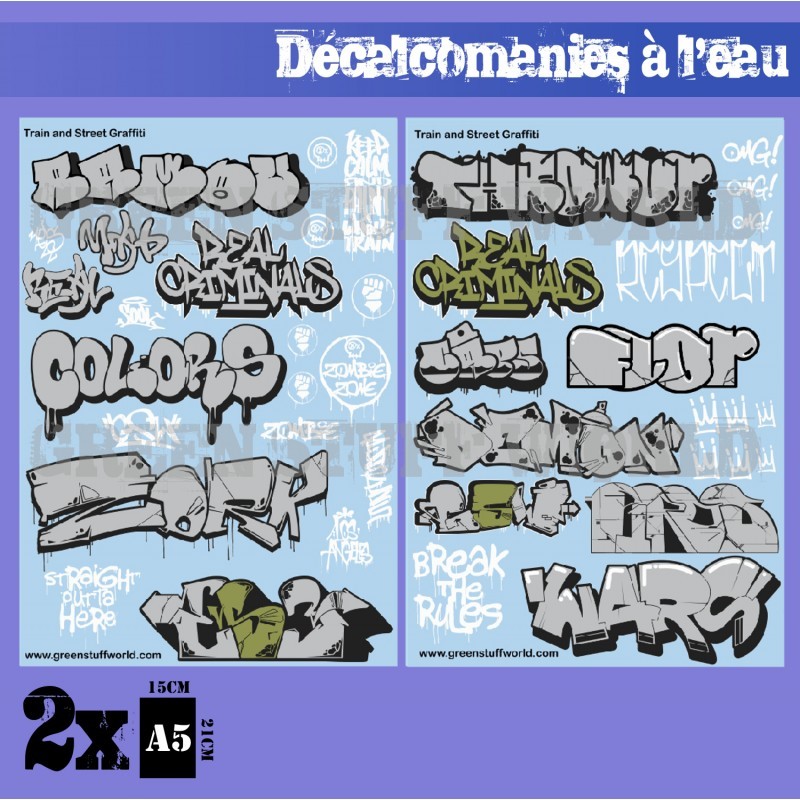 Chaque feuille de décalcomanie de glissade d’eau contient une grande variété de graffitis de différentes tailles et formes qui vous permettront de personnaliser votre champ de bataille, votre bâtiment et votre diorama.