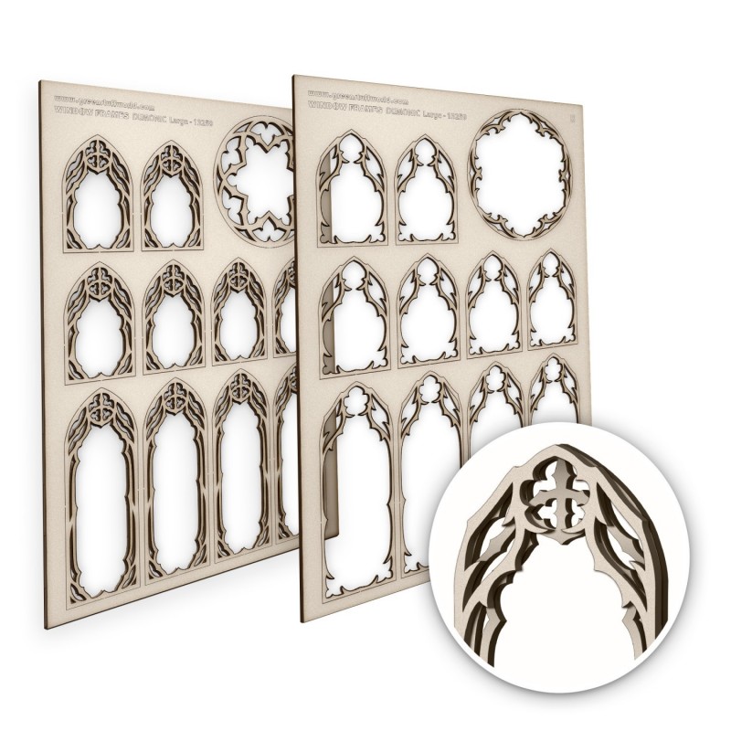 Fenêtres miniatures - DEMONIC (Grandes) Les cadres de fenetres maquette sont des versions réduites et méticuleusement fabriquées de vraies fenêtres, con©ues pour être intégrées dans des dioramas modernes et fantastiques, tels que les maisons de poupées. Ces cadres jouent un rôle crucial dans l'amélioration du réalisme et des détails des dioramas, en définissant le style architectural et l'époque des maisons. Ils peuvent être installés sur des maisons à échelle réduite préfabriquées ou construites sur mesure à l'aide d'adhésifs à séchage transparent. Les outils indispensables pour créer, peindre et installer ces cadres sont des lames tranchantes, des pinces et des pinceaux à pointe fine. Les cadres de fenêtres miniatures sont essentiels pour donner vie aux petits modèles, qu'il s'agisse d'une charmante maison de poupée ou d'un diorama détaillé. Améliorez ou complétez votre finition en les combinant avec notre collection de vitraux miniatures, disponible exclusivement chez Green Stuff World, pour ajouter une touche étonnante et réaliste à vos créations. Nous recommandons d'utiliser de la colle blanche ou de la colle cyanoacrylate pour l'assemblage et de la peinture maquette pour la peinture, car ces cadres sont livrés non peints. Epaisseur : 2 mmTaille : 150x220 mmContenu : Chaque set comprend 2 parties (partie A + partie B) qui peuvent être utilisées ensemble pour plus de détails et de profondeur, ou séparément.