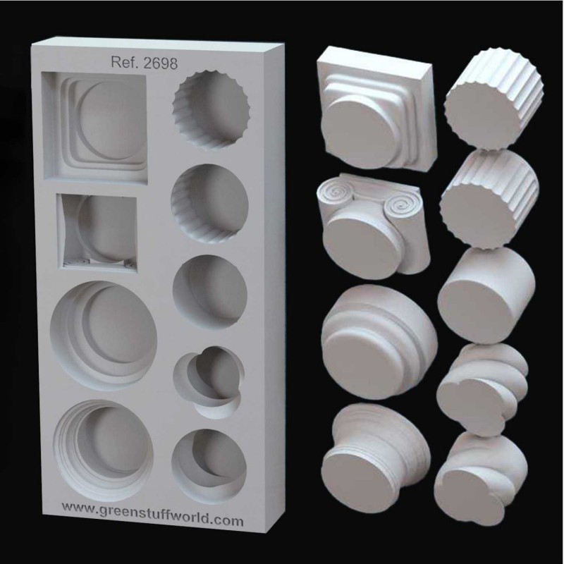 Moules Colonnes Moule silicone Colonnes semi-transparent de haute qualité, qui permet la création à la fois de colonnes complètes et de fragments de colonnes. Il comprend différents morceaux de colonnes dans différents styles architecturaux : dorique, ionique et salomonique ou même des combinaisons de tous ces styles. Valable à la fois pour la modélisation réaliste ou les créations de hobby, ainsi que pour l'architecture. ©?chelle d'environ 1:48 (wargames) à 1:35. Ces moules sont résistants à la chaleur, jusqu'à 240¶§C, et très durables. Les moules fonctionnent très bien avec tout type de résine, bien que pour une durée de vie plus longue, nous recommandons l'utilisation de résine acrylique. Attendez que le matériau soit complètement durci avant de retirer les pièces. D'autres matériaux tels que le milliput, le milliput mélangé à de la pâte à modeler, le magic sculpt et d'autres fonctionnent également mais sont plus difficiles à utiliser. Nous recommandons l'utilisation des palettes en acier flexibles pour éliminer l'excès de mastic / argile des moules sans les endommager. Comprend 1 moule en silicone à colonnes taille 6x12cm Diamètre des colonnes 20mm