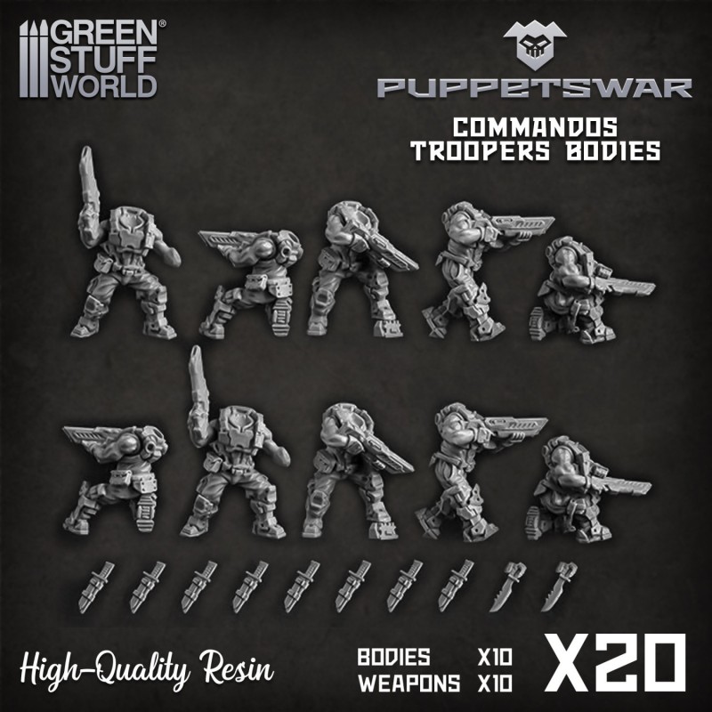 Corps - Soldats commando Ensemble de pièces en résine de haute qualité, con©u pour s'adapter aux figurines de wargames de 28/32mm, y compris les figurines GW©. Ces pièces ajouteront une touche créative à une collection existante de figurines de science-fiction, ou permettront même de créer des unités et des figurines entièrement nouvelles et sur mesure. Fourni non assemblé et non peint. Marque : Puppetswar Matériau : résine de haute qualité La hauteur maximale d'un modèle, du pied au sommet du dos, est de 30 mm. Les modèles sont dotés de fentes pour des aimants de 3x1mm. GW© est une marque déposée de Games Workshop Limited. Les produits proposés ne sont pas affiliés, autorisés ou approuvés par cette société. Green Stuff World fabrique et commercialise uniquement des produits compatibles con©us pour être utilisés avec cette gamme de figurines et d'autres gammes similaires.