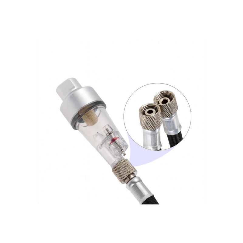 Ce mini filtre à air pour aérographe permet de retenir les particules d'eau éventuelles qui seraient dans un air ambiant humide et qui comprimées par le compresseur se transformeraient en goutelettes d'eau. Il se visse directement sur un aérographe muni d'une sortie 1/8e. Le mini filtre dispose lui même d'une sortie 1/8e. La cuve du filtre est transparente pour une meilleure visibilité et dispose d'une évacuation par clapet situé sur le bas afin de vider le filtre trop chargé en eau récupérée et stockée.