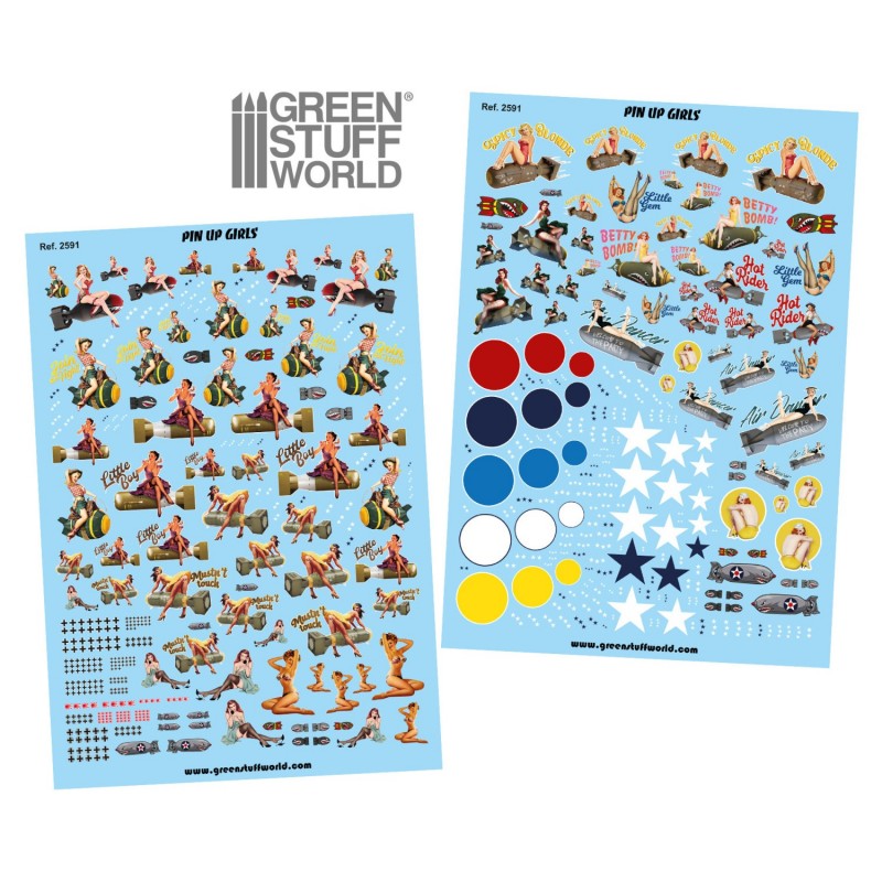 Les décalcomanies à base d'eau sont un type populaire de transfert décoratif qui peut être utilisé pour ajouter des motifs complexes et détaillés aux modèles réduits, y compris ceux utilisés dans le modélisme militaire et les wargames. Les décalcomanies de pin-up, qui représentent des images de pin-up de style vintage, sont particulièrement populaires. Les décalcomanies Green Stuff world sont utilisées par les modélistes pour ajouter une touche de personnalité et de charme vintage aux modèles. Ils peuvent être appliqués sur un large éventail de surfaces, y compris les véhicules, les bâtiments et même les figurines.