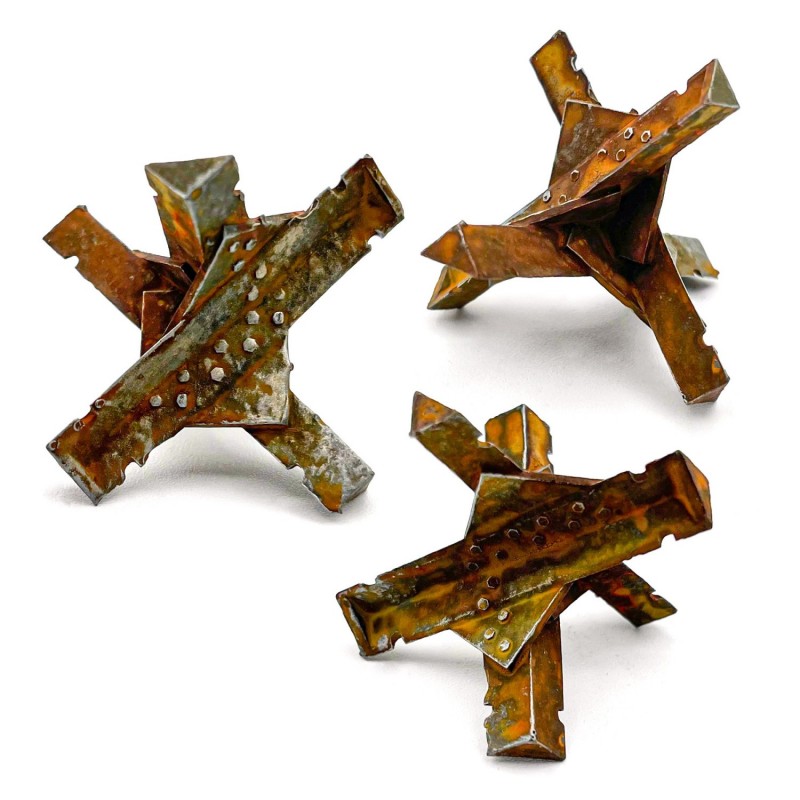 Les obstacles antichars pointus, connus sous le nom de hérissons tchèques, ont été développés en République tchèque pendant la Seconde Guerre mondiale pour empêcher les forces blindées de franchir la ligne de défense. Ils étaient utilisés pour bloquer les rues, protéger les entrées maritimes, protéger les soldats eux-mêmes, entre autres fonctions. Utilisez ces bits en résine pour donner à vos paysages de guerre une touche de réalisme.