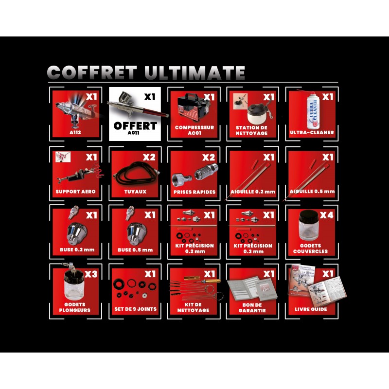 Le coffret Prince August Ultimate comprend 2 Aérographes double action : A112 Haute Définition et A011 Ultra Polyvalent OFFERT. Vous trouverez également le compresseur AC01 et son manomètre pour une pression d’air chiffrée.