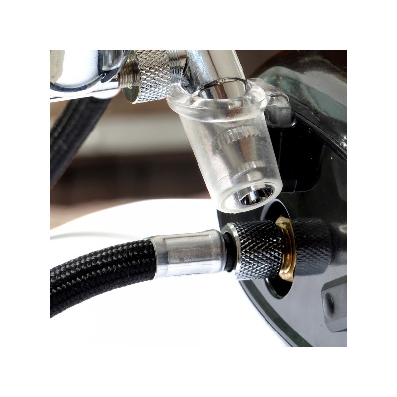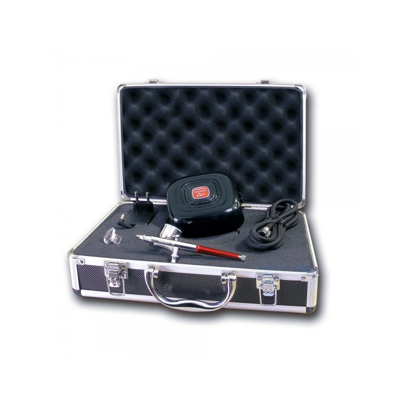 Dans cette mallette, vous trouverez également le micro compresseur AC04 au design épuré qui vous garantit une pression d’air stable, réglable d’un clic et visible instantanément grâce à ses trois Led. Son tuyau d’air renforcé d’1m80 à gaine tressée vous offrira, grâce à sa taille et à sa souplesse, un confort de travail incomparable.