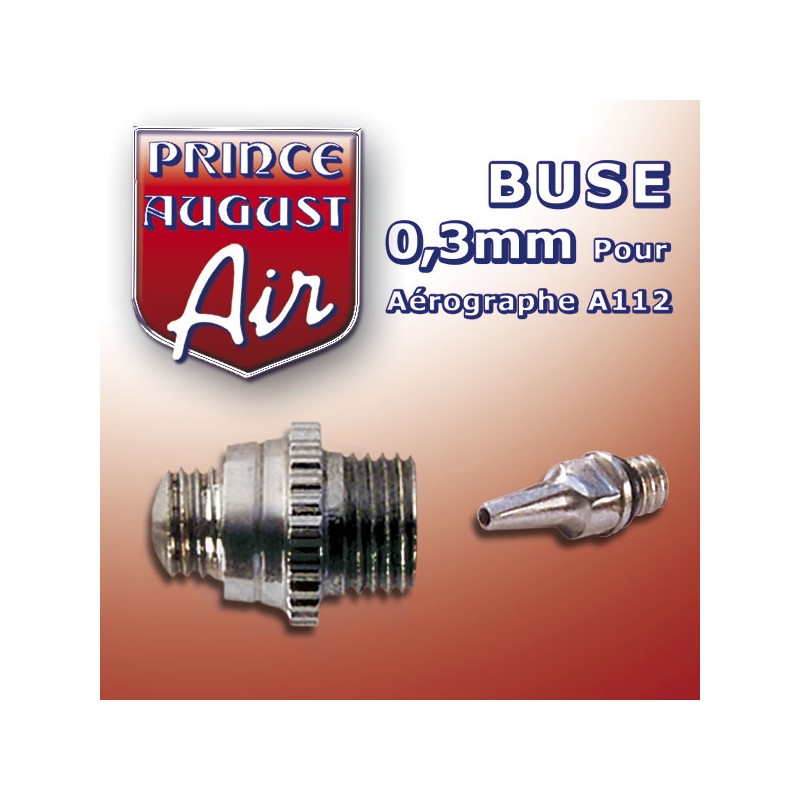 Buse de 0, 3mm pour Aérographe Prince-August A112. Pour remplacer la buse de votre Aérographe A112 Prince-August, démontez le protège-aiguille et la tête d’air puis dévissez la buse à remplacer à l’aide de la clef de démontage. Vissez ensuite la nouvelle buse à l’aide de la clef avant de revisser la tête d’air et le protège-aiguille.